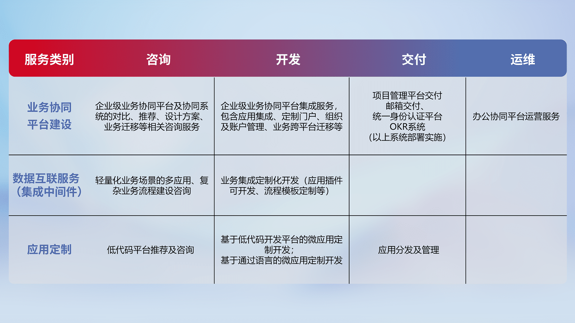 针对钉钉、、企微、、、、IDaas等平台级产品提供产品的规划、、、方案、、、、交付、、、、定制化开发等服务,,实现如统一协同办公、、、、智能客户服务、、、、混合会议管理、、智能数据查询、、、等业务场景,,,实现数字化转型。。。。